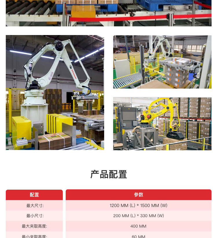 介紹:頂升抓取機構帶有置中、疊包功能,可配合前疊包平衡碼垛效率;專業設計的紙板夾具帶有鉤,可夾取放置一層或兩層紙箱防掉落;機器人采用四軸式Kawasaki機械手臂兼顧性能與成本,將紙箱按自定義的垛型自動碼放到托盤上。 產品別稱:紙箱碼垛機械手、自動流水線紙箱碼垛機、紙箱碼垛、機器人紙箱碼垛、紙箱碼垛機器人