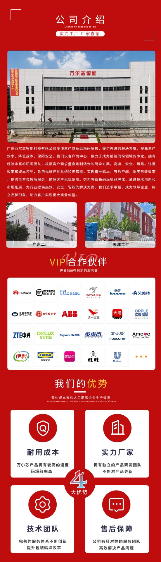 介紹:大型機械手碼垛機是一種高度智能化的包裝設備,主要由大型機械手臂、先進的控制系統、傳感器和夾具組成。它具備強大的抓取能力和承載能力,可以自動地完成大規模產品的抓取、碼垛和放置任務。大型機械手碼垛機通常應用于高產、大批量生產的生產線,可以顯著提升生產效率,降低人力成本,同時保證產品的穩定性和包裝質量的一致性。這種機器人碼垛機廣泛應用于各行各業,如物流、汽車、電子、建材等領域,為企業實現智能化、自動化生產提供了有力支持。其先進的技術和靈活性,使其成為現代化生產線不可或缺的重要設備。